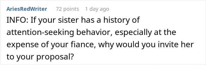 But he also gave some additional information about his sister’s attention-seeking behavior, where she had fake fainted at parties and even set off the fire alarm at his fiancé’s birthday party and ruined it. Additionally, she had also falsely declared she was pregnant at the same party where OP announced his promotion and once even laced the punch with alcohol even when she knew that the poster was on medication that strictly prohibited drinking.