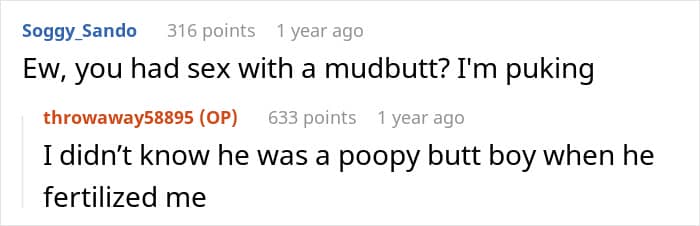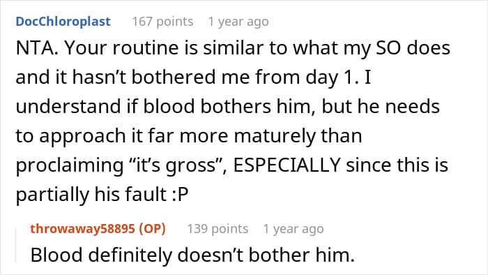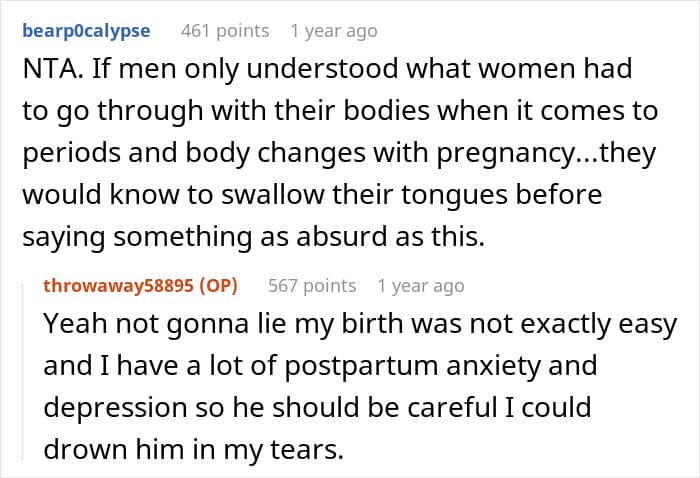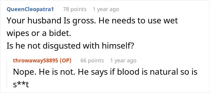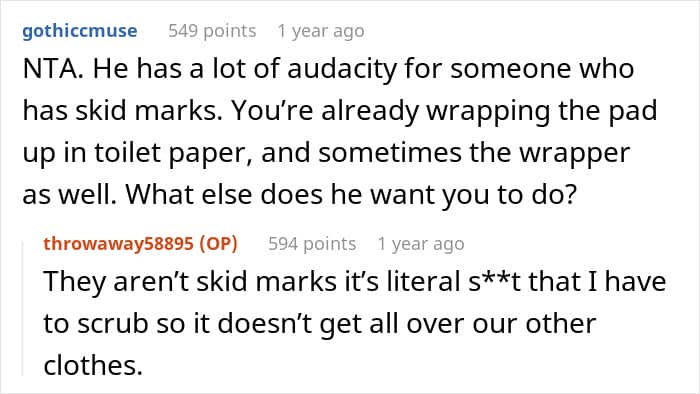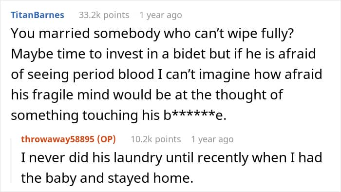 “AITA for telling my husband I’ll dispose of my feminine products when he wipes better?” – this new mom took to one of Reddit’s most judgmental communities, asking its members if she’s indeed a jerk for telling her husband to learn to wipe better after he made a remark about her bloody sanitary pads. The post managed to garner nearly 30K upvotes as well as 2.5K comments discussing the matter.