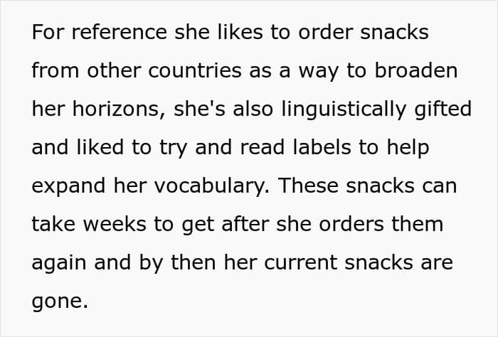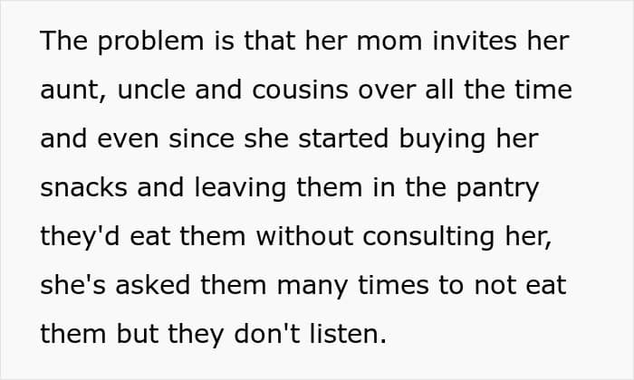 Unfortunately, the family didn’t listen and continued doing their thing. The mom didn’t tell the family anything about this behavior either, saying that since the daughter kept the snacks in the pantry, they should be available to everyone.