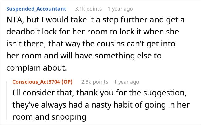 The dad didn’t agree with this, so he decided to get the daughter a locked box. He even customized it with additional locks, so the cousins wouldn’t get in. The daughter was grateful for it and locked the snacks in her room.
