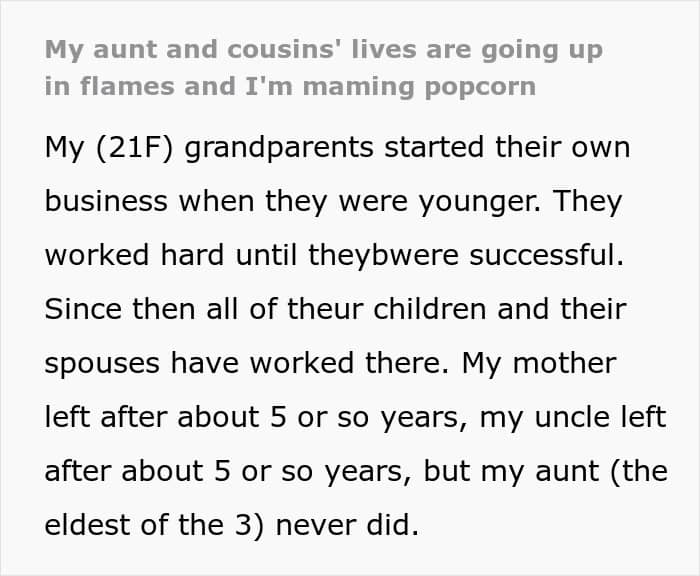 In today’s story, Reddit user Spiritual_Pickle4405 tells us that her grandparents started their own business when they were young, and after putting in a lot of effort, they were successful. Now, these hard workers had 3 kids. OP’s mom and uncle moved away after growing up, but her aunt stayed in the business.
