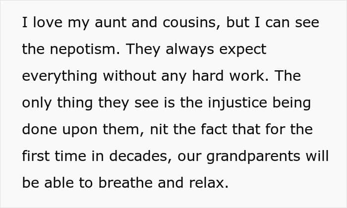 That sounds just like the aunt and her family. Many people condemned them for their extreme sense of entitlement. They were more furious at the fact that they mooched off of the grandparents’ hard work. But the fun part was when OP mentioned that they were removed from the will and everything was going to be left to all the grandkids.