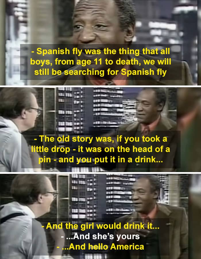 After all, Bill Cosby had a long history of randomly bringing up Spanish fly, a supposed aphrodisiac. And, more disturbingly, in a 1990 interview with Larry King, he even discussed slipping it into women’s drinks.