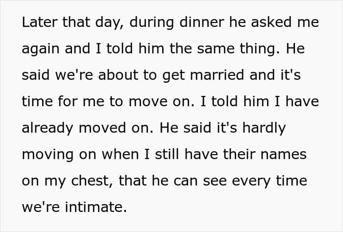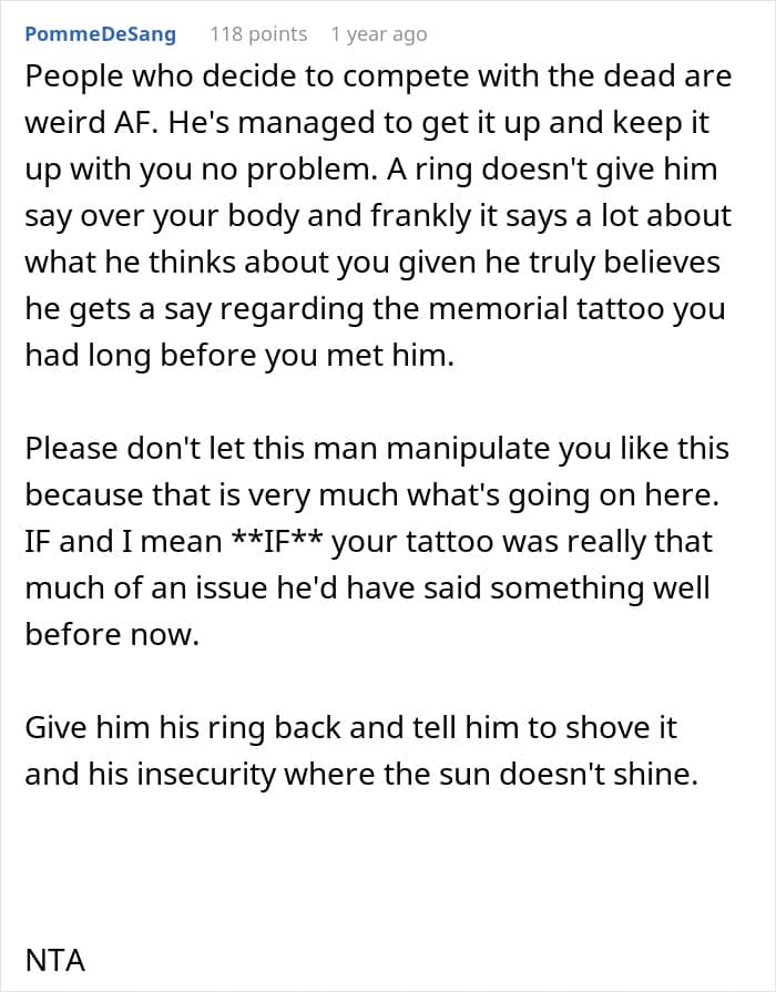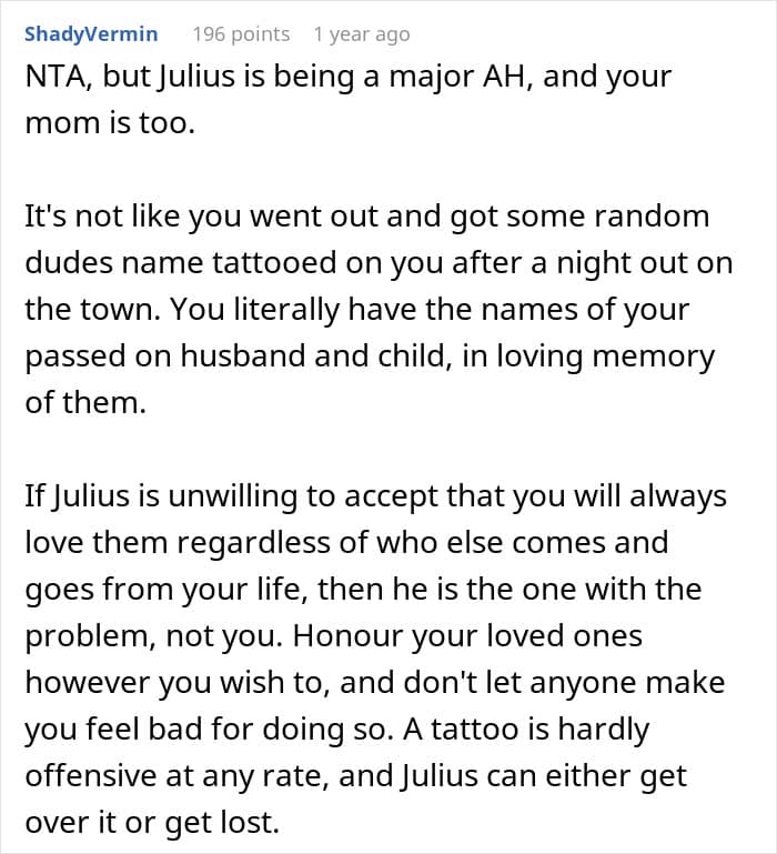 To this, the author simply stated that being jealous of the past is wrong, and that she has already moved on by starting a new relationship. And, accordingly, she’s not going to remove the tattoo, which reminds her of her loved ones who have passed away. Well, Julius accepted this answer, but since then, as our heroine says, he’s been giving her the cold shoulder. Moreover, when the woman called her own mom for advice, she said that she could understand how Julius felt…