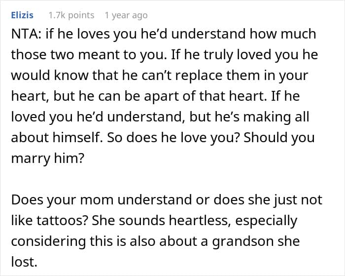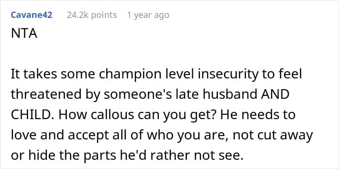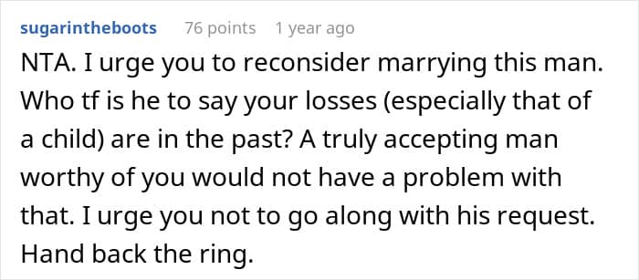 Well, commenters en masse slammed Julius over his demand, finding it weird, to say the least. In general, the range of opinions among people in the comments varies from mild misunderstanding to absolutely destroying the OP’s fiance. “Your mementos of your loss are yours. His insecurities are his problem. Not yours,” one of the commenters wrote.