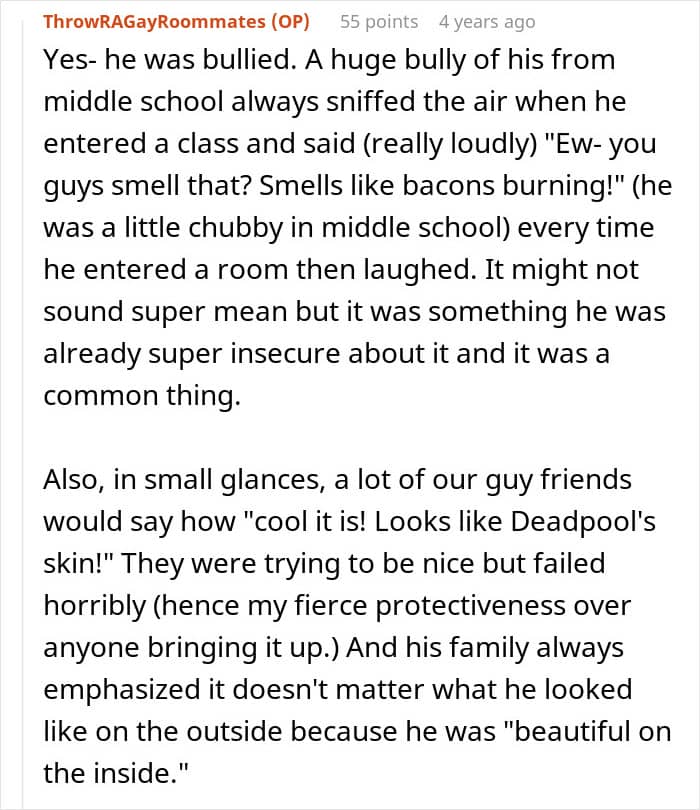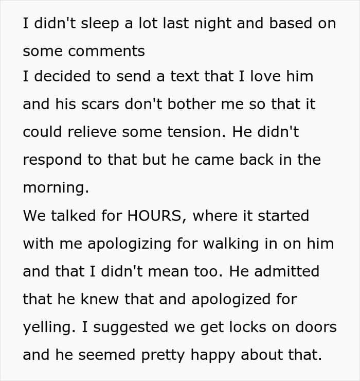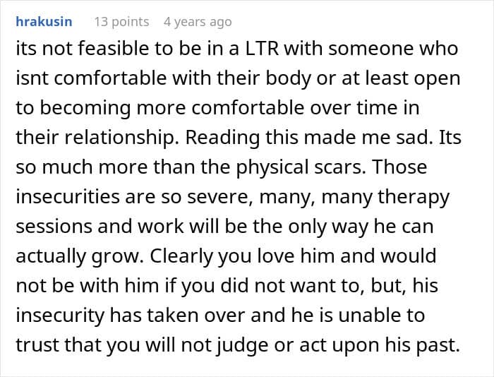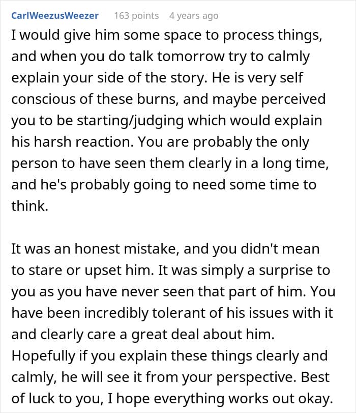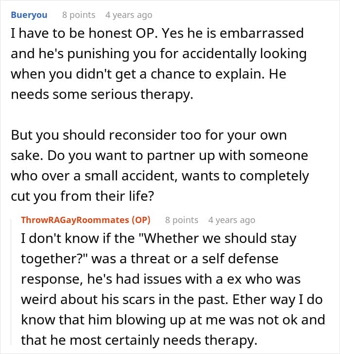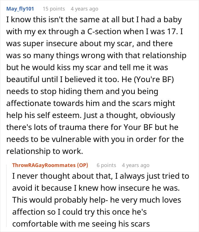 This couple faced a crisis because of one partner’s insecurity about his body. Having suffered a fire in childhood, the guy was left with severe burn scars and had issues with people seeing his body. After his boyfriend accidentally walked in on him in the bathroom, he freaked out and immediately called for a breakup. Panicked, the boyfriend turned for help to the internet.