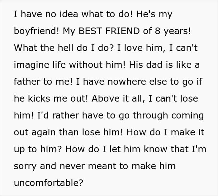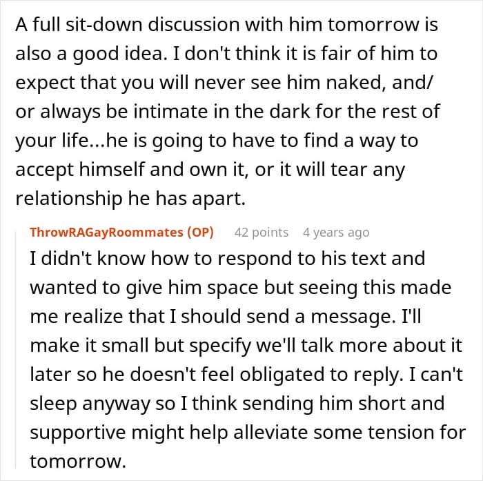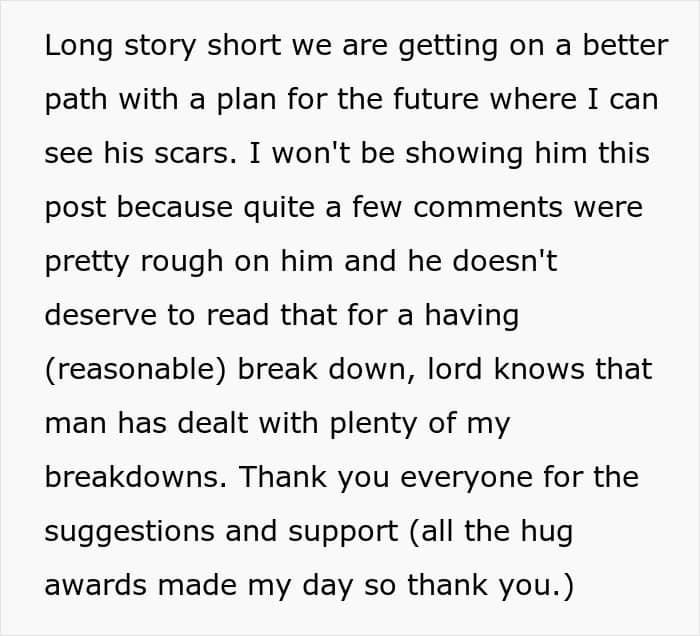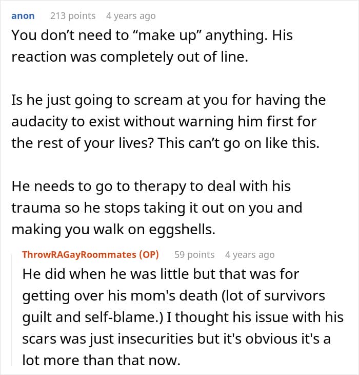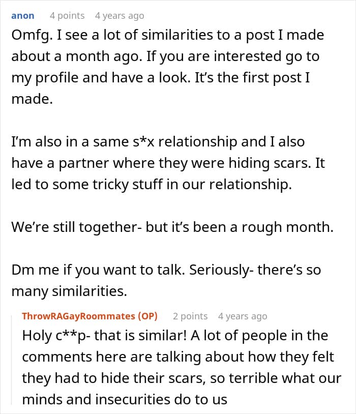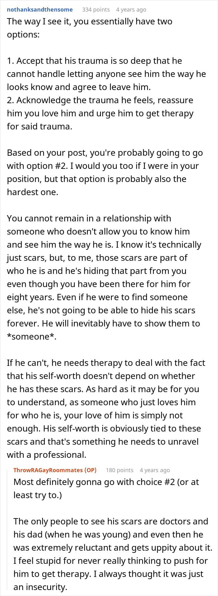 This couple faced a crisis because of one partner’s insecurity about his body. Having suffered a fire in childhood, the guy was left with severe burn scars and had issues with people seeing his body. After his boyfriend accidentally walked in on him in the bathroom, he freaked out and immediately called for a breakup. Panicked, the boyfriend turned for help to the internet.