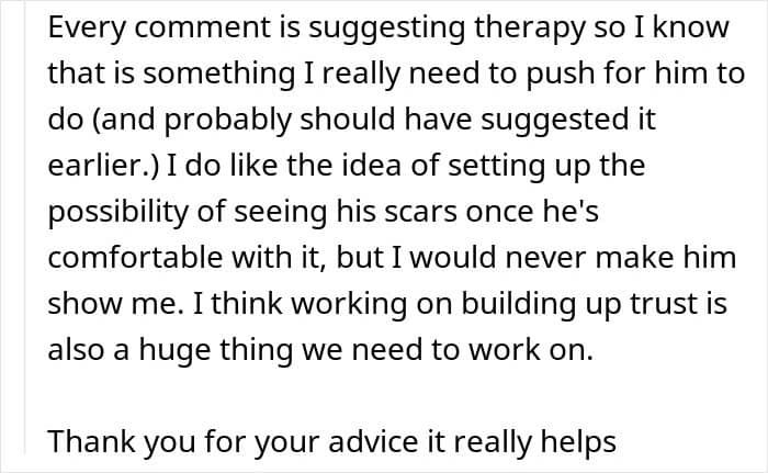 For people who haven’t experienced similar trauma, it might be difficult to understand the boyfriend’s behavior. But it’s common for someone with severe burn scars to have grave body image issues.