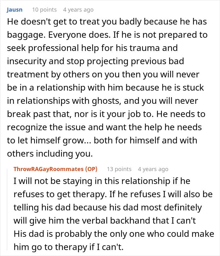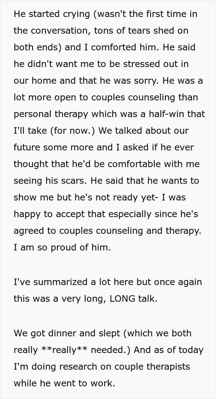 In a later update, the guy detailed how the couple worked it out, but the boyfriend still wasn’t open to individual therapy