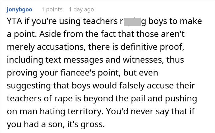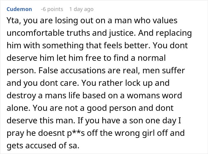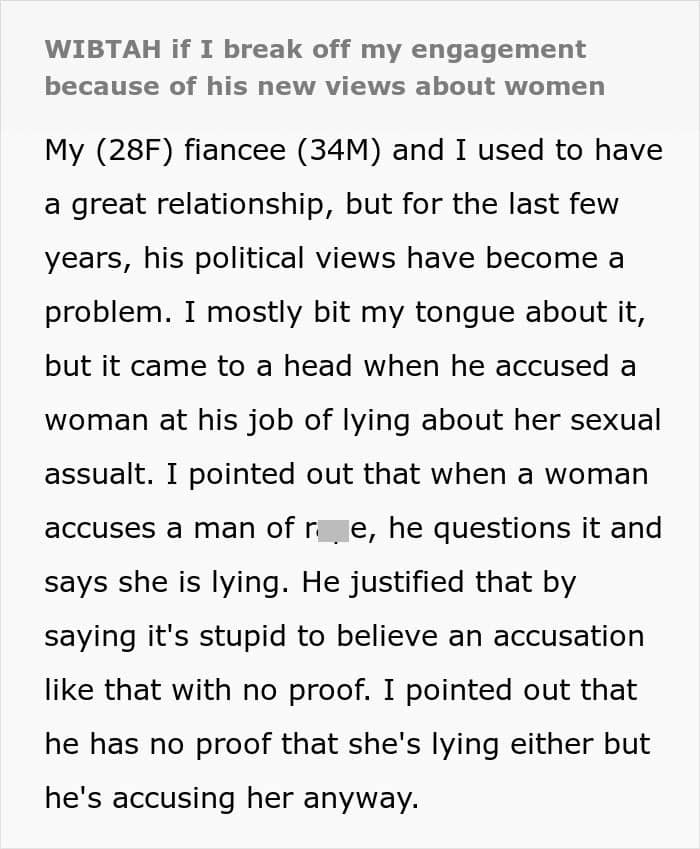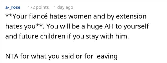But one woman grew exhausted from the horrible things her fiancé kept saying about women