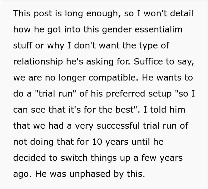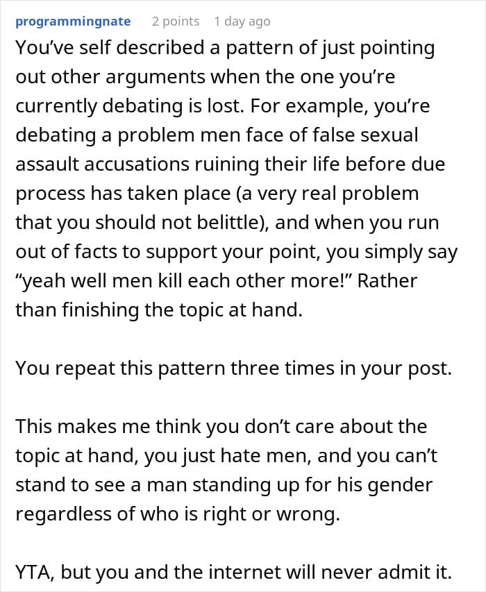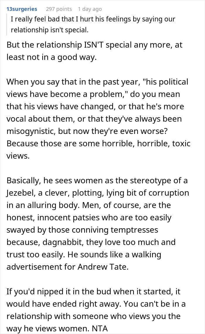 “I would like to add how important it is to take online radicalization seriously. Some people said that he was always a red-faced misogynist and just waited a decade to reveal his true self. If I’m being honest, I don’t think he was. Manosphere spaces are recruiting boys and men using cult-like tactics. They convince them that anything contrary to Men’s Rights rhetoric is a delusion, a trick, or a lie. Despite being together for 12 years (10 preradicalization), he now believes that we can not have a happy relationship unless I am a tradwife. Because he believes that he is trying to save our relationship and save me from “feminist brainwashing”, he can’t be moved. Writing him off as “always a secret misogynist” ignores the serious problem of online radicalization.”