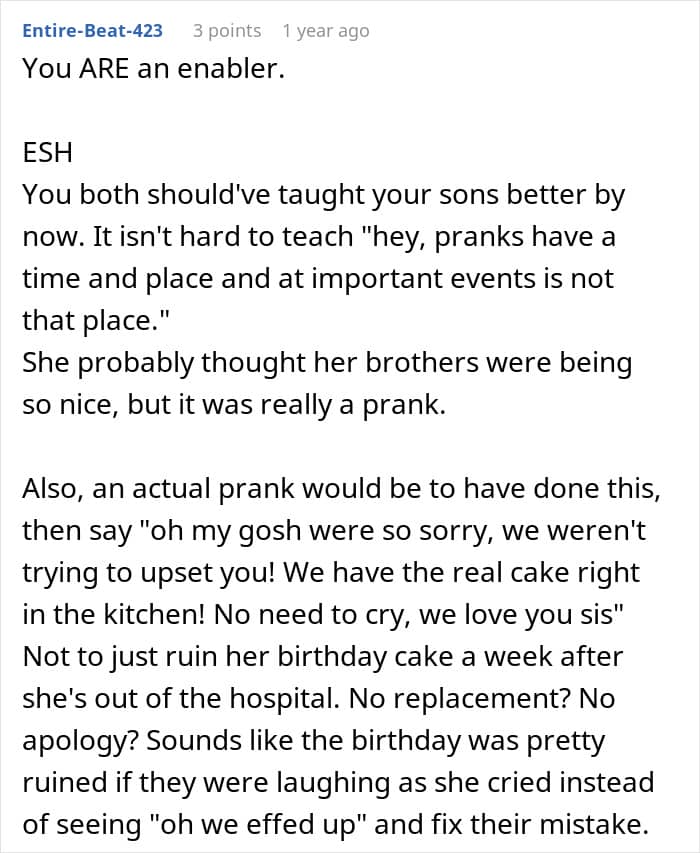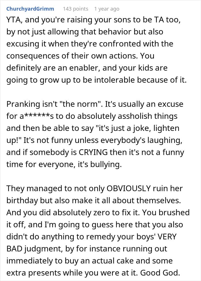 These two boys, unfortunately, didn’t think through how their stepsister would react to their little prank. After she found out they messed with her cake, she burst into tears, feeling like her celebration was ruined.