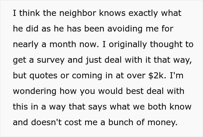 OP added that he thinks the neighbor knows he’s at fault, since he’s been avoiding him for almost a month. OP has since gotten some quotes for surveys, but they’re quite pricey, so he resorted to asking the Reddit community whether or not there’s another way around the issue.