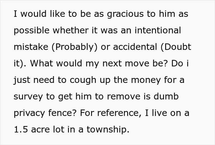 For one guy who acquired a 1.5-acre lot in a township, things got off to a rocky start when his neighbor built a privacy fence over 10 feet into his property. The neighbor’s behavior towards him since he moved in has been avoidant at best, so now the man has turned to Reddit to ask for advice.