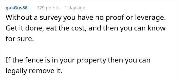What would you do if you found yourself in OP’s situation? Try speaking with the neighbor again, or just shell out for the survey? Let us know your opinions in the comments!