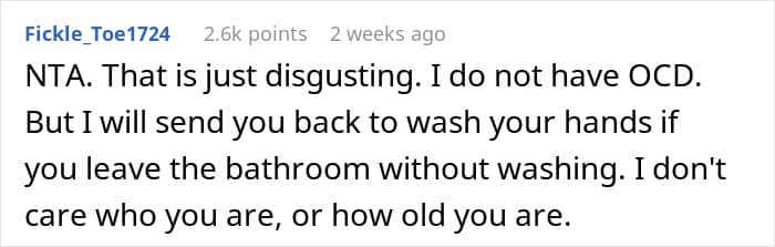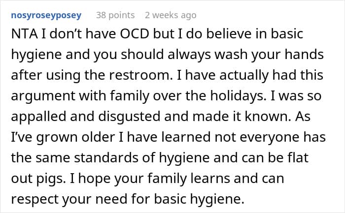 You’d think that after all that, the least they could do is not go out of their way to trigger her. But alas, common sense and maturity were evidently taking the day off. Especially for the family member in question, “Uncle Hygiene,” who’s also the OP’s housemate. When our guy casually strolled out of the bathroom without washing his hands, the OP playfully teased him into washing up. He complied, they laughed, and all was well in the land of hand soap.