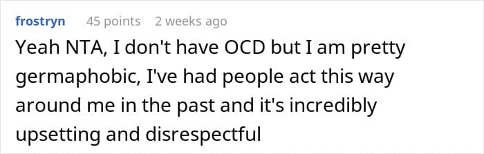 The OP (original poster) is a 23-year-old woman who has been dealing with obsessive-compulsive disorder (OCD) since childhood, specifically contamination-related OCD, meaning germs aren’t just a mild inconvenience to her—they’re a major source of anxiety. She’s spent years in therapy, put in the hard work, and even went the extra mile to educate her family about her condition.