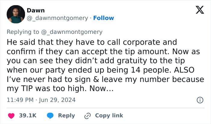 The manager said that he would have to call corporate and confirm if they could “accept the tip amount,” which is why he also made Dawn sign the bill and leave her contact information