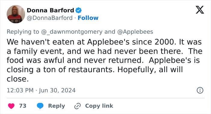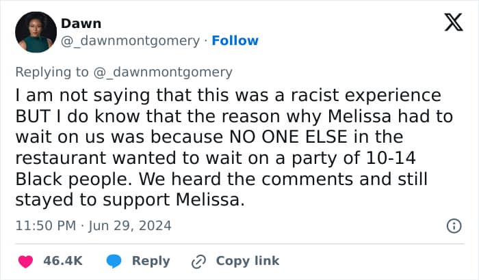 The poster was enraged by the incident and felt that the manager might have been racist for creating a scene about the money. She also observed and heard that other waiters refused to wait on their table just because they were black. Dawn tagged Applebee’s in her tweets to make sure corporate would know about her experience and also give Melissa the full tip.
