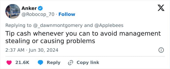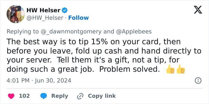 One interesting thing that folks pointed out about Dawn’s situation was that she paid the bill and the tip by card. According to CardFellow, “Tips added after a card is authorized may not be accepted by the card issuer, especially if the amount exceeds 20% of the original transaction. This means that there’s a potential risk for the restaurant if the bank declines the additional tip amount, leaving them on the hook for the difference.”