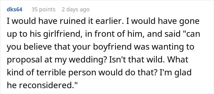 Take this bride, for instance. Despite having a cousin who was eager to steal her spotlight and pop the question to his girlfriend right during the reception, she managed to come up with a clever plan to stop him and have her well-deserved big day go smoothly.