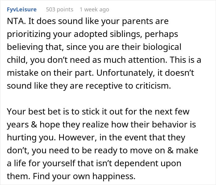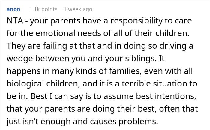 Well, no wonder he feels jealous of his adopted siblings, because his parents have been mostly absent for the major occasions in his life. At times, they even demanded that the poster give them space with the other children so that their bonding activities were not disrupted. Ouch, that does sound quite hurtful.