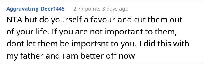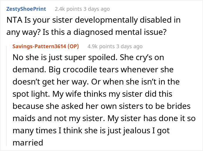 At the same time, a child who is shown special treatment might let that go to their head. “Favored children may feel a sense of entitlement, and that rules do not apply to them,” Dr. Gidenko explained. That sounds very similar to the sister in this situation. According to the groom, his sister frequently has meltdowns and ruins his most important days. Perhaps she cannot handle not being in the spotlight, so she, consciously or subconsciously, sabotages his most important days.
