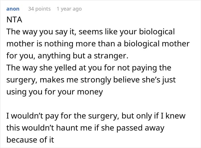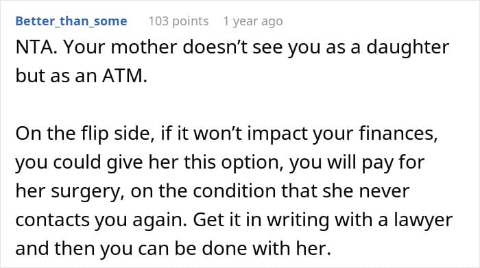 Unfortunately, in the OP’s situation, it’s unclear if her mother wanted to repair a broken relationship, or if she was planning on playing the obligation and guilt cards in order to receive financial support. Be that as it may, the redditor refused to pay for her surgery, which, seemingly, split the online community into camps, as while some supported her decision, others said helping her mother out wouldn’t hurt her.
