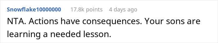 Commenters do believe that the mom is really trying to teach her older children to feel the consequences of their actions, and that the dad’s (and especially grandma’s) reaction in this case was completely wrong and immature, because they actually undermine the mother’s authority in the eyes of her own kids. “Maybe let dear grandmother take the boys over a weekend (at her house) and the rest of you go on a mini break,” one commenter wrote rather sarcastically. Well, it might actually work… What do you think?