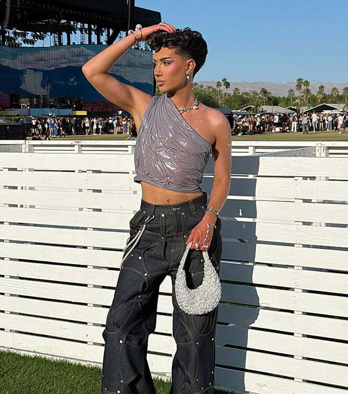 James Charles seemed to turn himself into a DIY project, showing up at the music festival in what appeared to be pearls stuck to his skin.