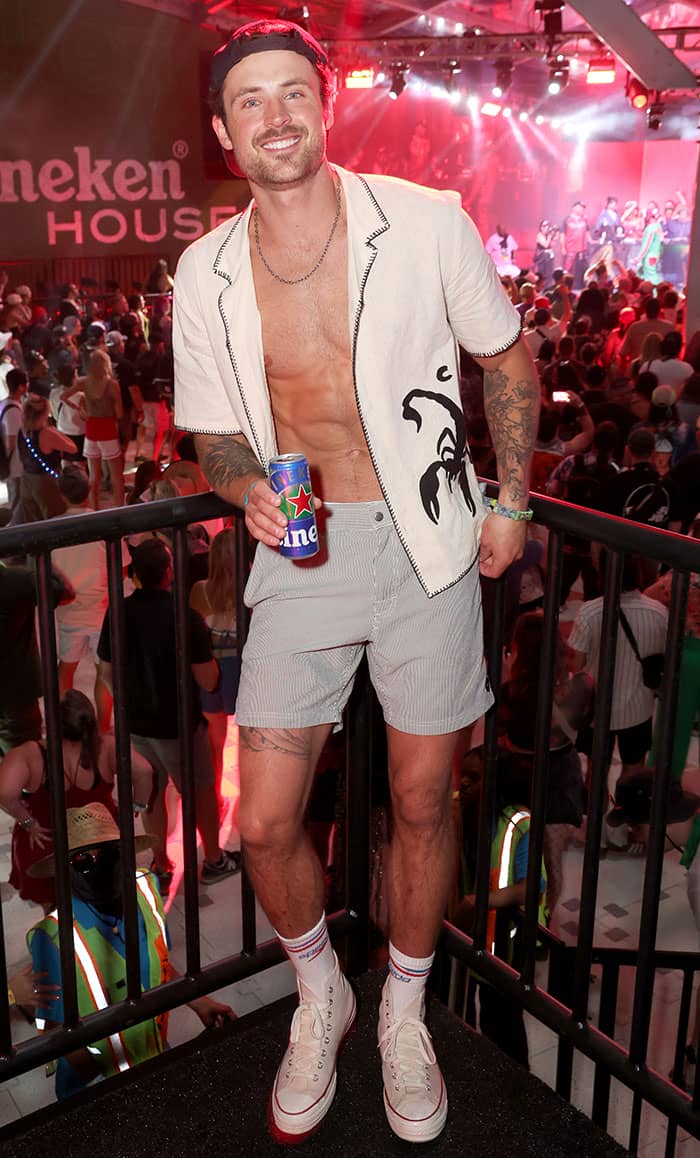 Dylan Efron brought a laid-back vibe to Coachella 2025, wearing an unbuttoned short-sleeve shirt and putting his toned abs on display.