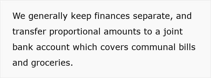 According to OP, her husband earns quite a bit more than she does and they generally keep their finances separate, apart from sharing a joint bank account which they use to cover communal bills, groceries, phone bills, and gym memberships for their kids.