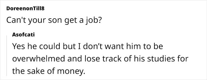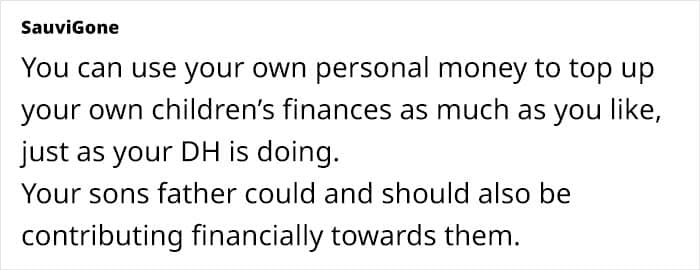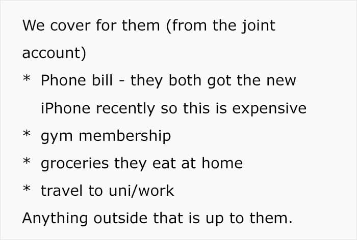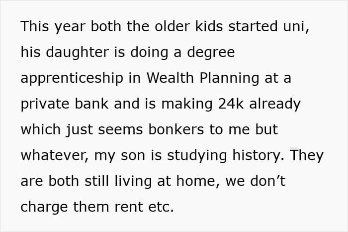 This year, both OP’s oldest son and her husband’s daughter started university. Her son is studying history while his daughter is completing a degree apprenticeship in wealth planning. OP adds that her hubby’s daughter earns a healthy salary, but her son earns nothing. Both children are still at home and aren’t charged rent.