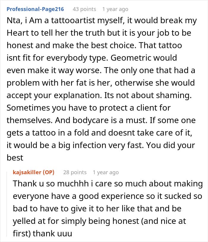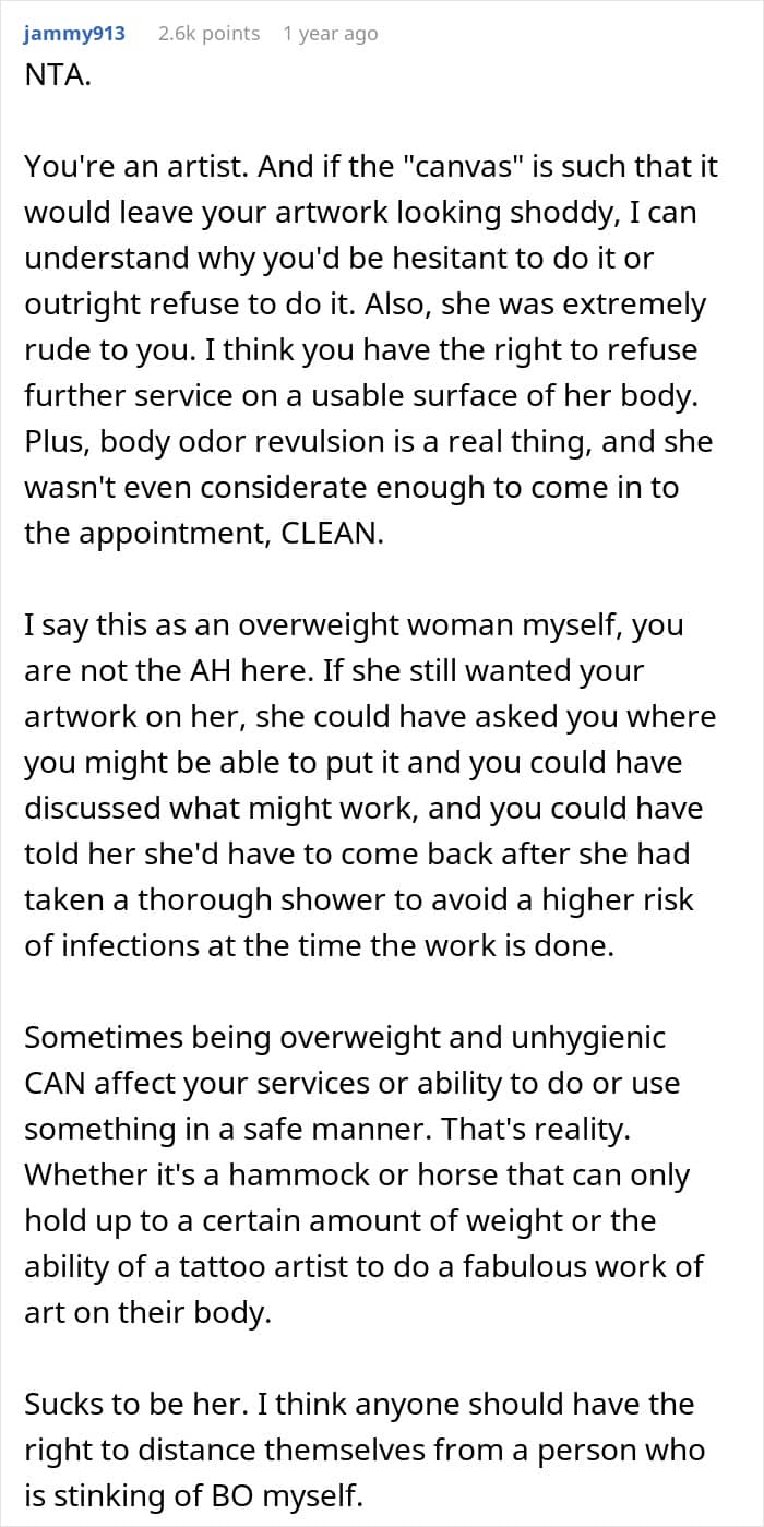 This is what happened to the OP of this story. She, a tattoo artist, already agreed on the design and placement of a tattoo with her client. But when the client showed up at the salon, the artist decided that her initial design wouldn’t be possible due to the woman’s plus-sized body. After a verbal altercation with the client, the OP came to Reddit to ask others whether her behavior was inappropriate.