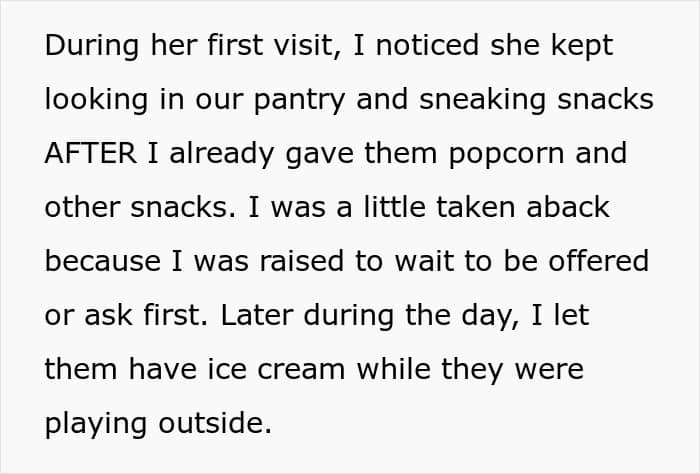 This pattern only intensified. One time, while the girls played outside, the friend helped herself to not one, but three ice cream bars, including a secret trip to the garage fridge. It was a small red flag, but the OP decided to brush it off, chalking it up to the friend being extra hungry or shy about asking.