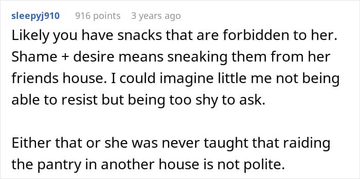 It all began with a sweet new friendship formed through a local rec sports team. The OP’s daughter became fast friends with another girl, and weekend hangouts quickly became the norm. But during the very first visit, the OP noticed something a little… off. Despite being given snacks and popcorn, the friend kept eyeing the pantry and sneaking more food without asking.