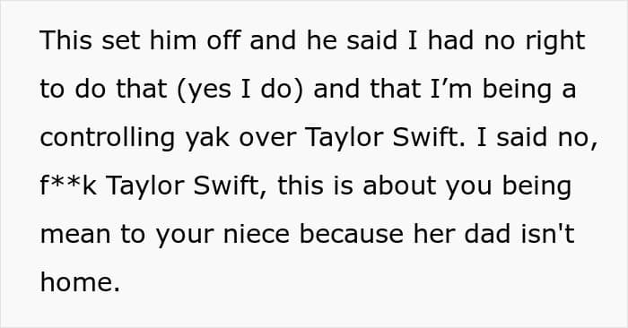 So, the OP decided to put an end to the jerkish behavior and told the man that if he didn’t stop his behavior now, he wouldn’t be attending the family’s summer vacation in Colorado. This threat caused the man to flip out even more and yap about how his family chose Taylor Swift over him.