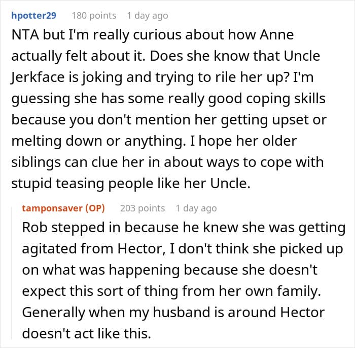 That’s something that today’s OP did. She saw her brother-in-law teasing her autistic daughter for her special interest and decided to interfere. Her way of doing so was banning him from the family vacation, which, let’s just say, caused quite a bit of family drama.
