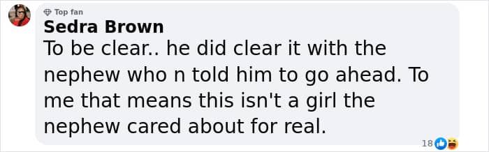 Naturally, the host was taken aback by such a revelation, so the guest had to clarify some things. For instance, the fact that the nephew was never in love with said woman. He also added that he already had feelings for her before realizing she was involved with his family member, which likely complicated things that much more.