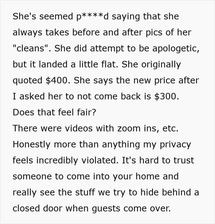 But even superheroes need a break. And when the dust bunnies became more like dust gorillas, she did what any sane person would do—called in the pros. The cleaner she chose came recommended by someone the OP trusted. The mission? A $400 deep clean followed by bi-weekly visits to keep things sparkling. Seems straightforward, right? Oh, not so fast.
