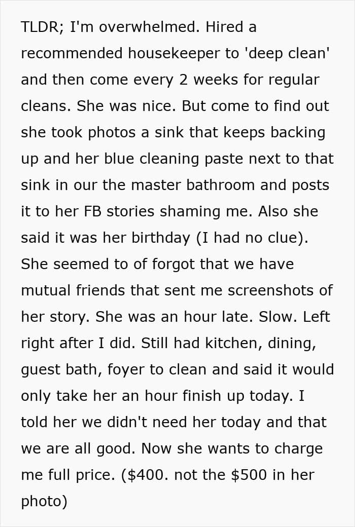 But wait, she did unclog a sink in the master bathroom. Yay, right? Oh, you sweet optimist, no. That sink would soon take center stage in the kind of drama you only expect from reality TV. While our Redditor was out picking up her daughter, the housekeeper texted, saying she had to leave too but would be back the next day to finish up. Reasonable? Maybe. But then the screenshots started rolling in.
