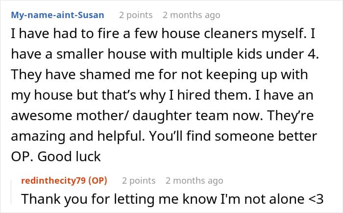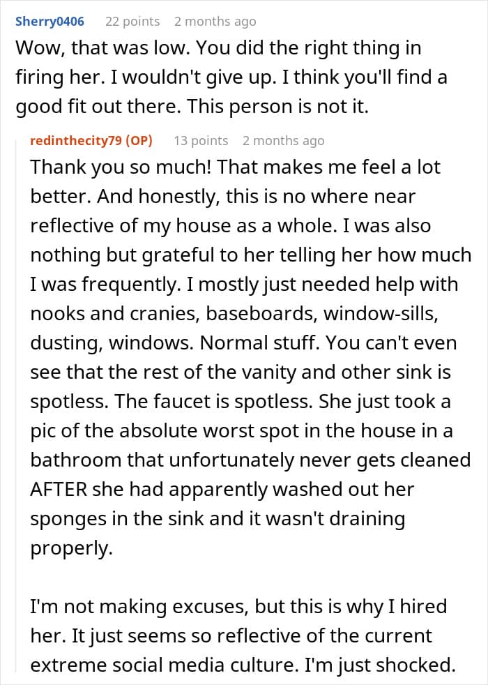 When the OP confronted the housekeeper about her impromptu internet fame, she got hit with some half-hearted apologies and a pinch of passive-aggressive sass. Oh, and a revised bill. The housekeeper decided her half-baked cleaning spree was worth $300 instead of $400.