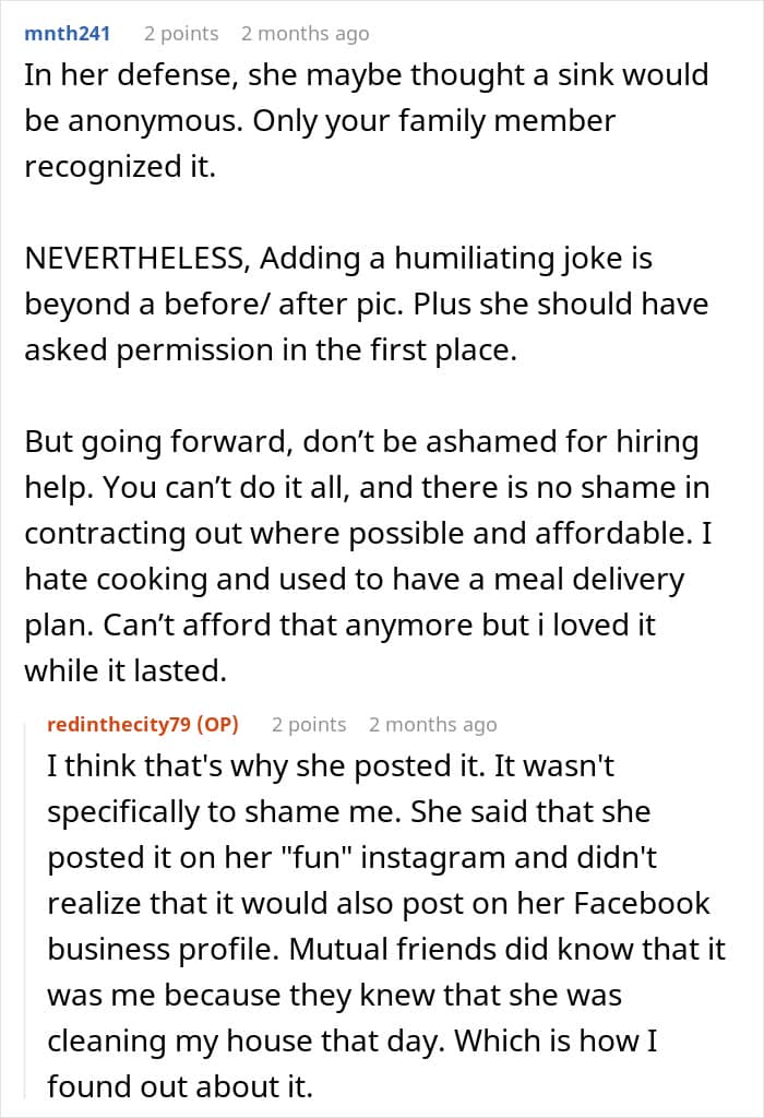 Apparently, this housekeeper’s second job is a wannabe social media star. She had plastered pictures of OP’s clogged sink all over her Facebook stories, complete with snarky captions. I’m talking zoomed-in shots that screamed, “Look at this mess!” Girl, you’re being paid to clean it, not roast it.