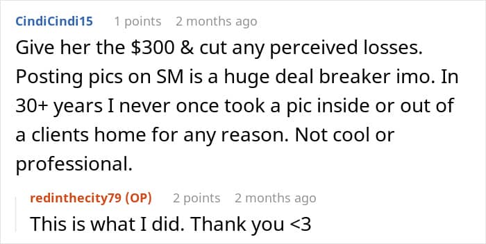 Listen, I get it. Before-and-after photos are reasonable, but there’s a difference between showcasing your work and making your client’s bathroom a viral meme. This wasn’t “Look at this amazing transformation!”—it was “Look how gross my client is!” Not cool, lady. Not cool.