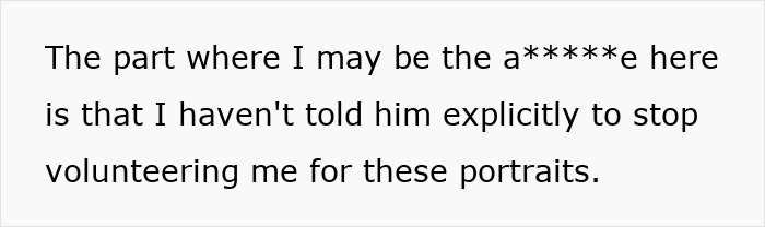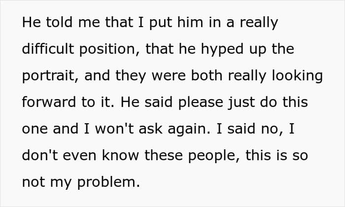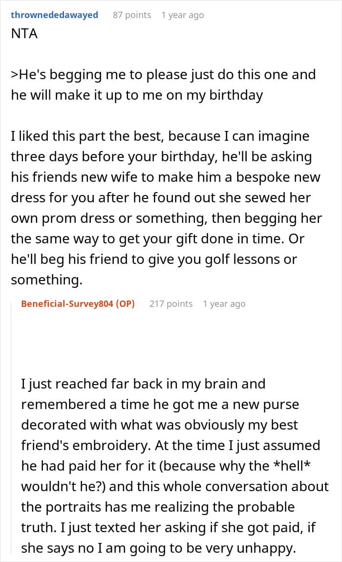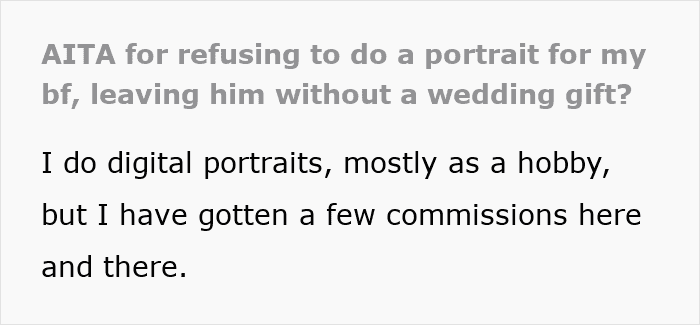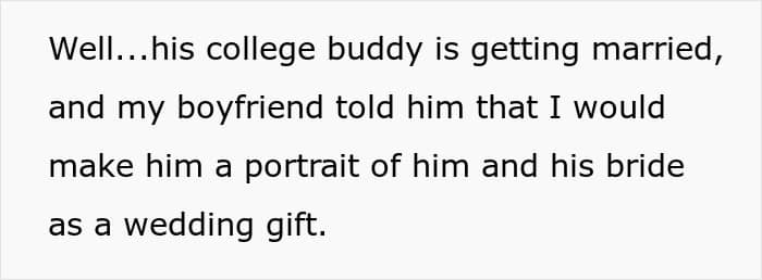 He’d buy a small gift and call it a joint effort, like her custom, time-consuming artwork was just a cherry on top. It wasn’t; it was the gift. But this guy really crossed the line when his college buddy, who our OP had never met, was getting married. And what did the genius do? Promise a custom wedding portrait.