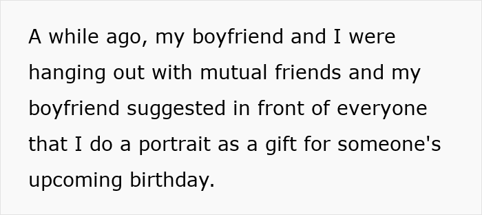 The woman’s boyfriend keeps telling people she will create custom portraits for them as gifts for different occasions, leaving her no choice but to do so