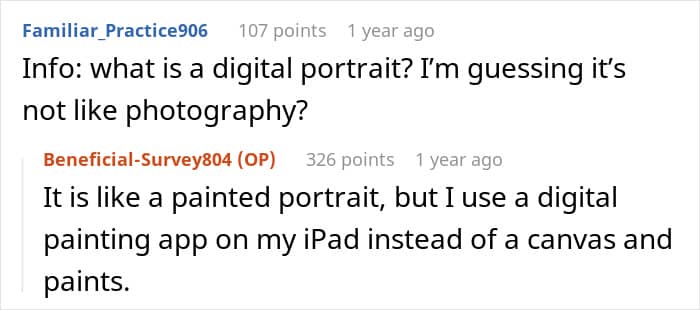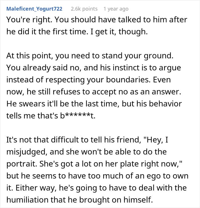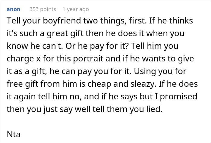 The OP (original poster) is a digital portrait artist. It’s her passion, and occasionally, her side hustle. Her boyfriend, however, thinks that because she can draw, she should draw all the time. It started with one birthday. This guy suggested, in front of all their friends, that she do a portrait as a gift.