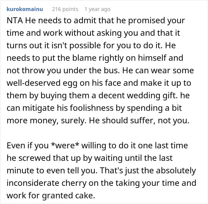 Oh, and when did he tell the OP? Days before the wedding. Not weeks, when he actually made the promise, but days. The OP finally had enough and lost it. She declared she was not a one-woman art sweatshop running on boyfriend guilt and fumes.