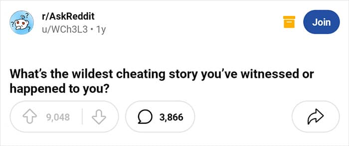 To better understand the lengths people go to in order to satisfy their desires, Reddit user WCh3L3 made a post on the platform, asking, “What’s the wildest cheating story you’ve witnessed or experienced?” An interesting question, considering that many of us might not recognize the signs of an affair even if we suspect our partner.