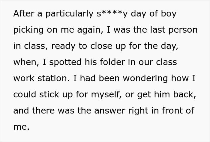 Well, one day when OP was the last one left in the classroom, she spotted her bully’s folder by the class workstation. Sensing the opportunity for a cunning get-back, she snuck the folder into her bag and left the school grounds. Without a second thought, she threw her tormenter’s work in a dumpster behind the nearby Starbucks and went on her merry way.